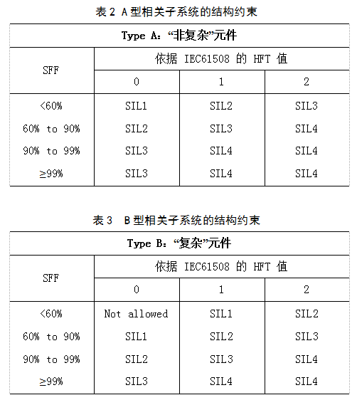 A型和B型相關(guān)子系統(tǒng)的結(jié)構(gòu)約束將會(huì)依照IEC61508-2 中的相關(guān)表格(見(jiàn)表 2、表 3),SIL等級(jí)將會(huì)受限于安全失效分?jǐn)?shù)(SFF)和硬件故障裕度(HFT)。