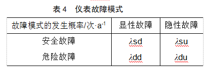 利用FMEA(Failure Mode Effect Analysis)分析方法可將儀表故障分為4種模式(見(jiàn)表4):顯性安全故障λsd(如雷達(dá)液位計(jì)高頻模塊故障)、隱性安全故障λsu(如電流輸出短路)、顯性危險(xiǎn)故障λdd(如壓力傳感器損壞)和隱性危險(xiǎn)故障λdu(如電流輸出“凍結(jié)”)。