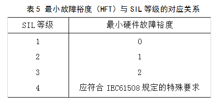 硬件故障裕度(HFT)指部件或子系統(tǒng)在出現(xiàn)一個(gè)或幾個(gè)硬件故障的情況下,功能單元繼續(xù)執(zhí)行所要求的儀表安全功能的能力。硬件故障裕度是對(duì)冗余程度的一種描述。一個(gè)硬件故障裕度(HFT)N意味著N+1個(gè)故障將引起安全功能喪失。除了通過(guò)合適的設(shè)備選擇以外,還可以通過(guò)子系統(tǒng)冗余設(shè)計(jì)滿足所需要的安全等級(jí)。表5是ANSI/ISA-84.00.01給出的有關(guān)現(xiàn)場(chǎng)設(shè)備的最小故障裕度(HFT)與SIL等級(jí)的對(duì)應(yīng)關(guān)系。