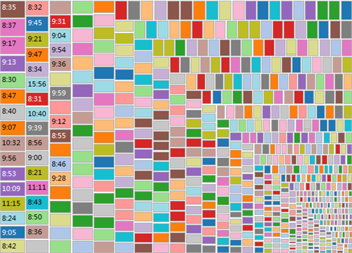 運(yùn)用數(shù)據(jù)可視化軟件的“樹(shù)地圖”功能,在連接到數(shù)據(jù)源后,依次雙擊字段“記錄數(shù)”和“時(shí)間”,再單擊“智能顯示”下拉菜單選項(xiàng)中的“樹(shù)地圖”,然后將“時(shí)間”字段拖曳到標(biāo)記“顏色”框中,即可實(shí)現(xiàn)第三方作業(yè)時(shí)間的可視化(如圖3)。圖中顏色深淺和方塊順序(自上而下,自左至右)分別表示同一作業(yè)時(shí)間所包含事件記錄的多少。