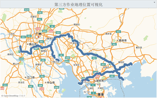 以施工活動(dòng)臨近管道的最近樁號(hào)作為基準(zhǔn)點(diǎn),將DPMS系統(tǒng)中脫密后的管道標(biāo)識(shí)樁位數(shù)據(jù)表與2014~2016施工活動(dòng)數(shù)據(jù)表在TABLEAU軟件中進(jìn)行關(guān)聯(lián),將脫密后的“X坐標(biāo)”及“Y坐標(biāo)”分別轉(zhuǎn)換為“地理角色”中的緯度和經(jīng)度,并將其從數(shù)據(jù)源顯示框中的“度量”欄拖曳到“維度”欄,再分別雙擊“X坐標(biāo)”及“Y坐標(biāo)”,2014~2016年施工活動(dòng)的點(diǎn)位便呈現(xiàn)在TABLEAU自帶地圖上。如果將此時(shí)的背景地圖切換成DPMS系統(tǒng)當(dāng)前所應(yīng)用的高德地圖,即可實(shí)現(xiàn)施工活動(dòng)地理位置可視化(如圖4)。
