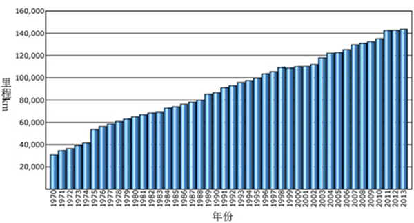 截至2013年,歐洲氣體管道事故數(shù)據(jù)組織(EGIG)管理的歐洲輸氣管網(wǎng)總長(zhǎng)度為143 727 km(圖10)。自1970年以來(lái),歷年管道事故數(shù)量呈下降趨勢(shì)(圖11)。