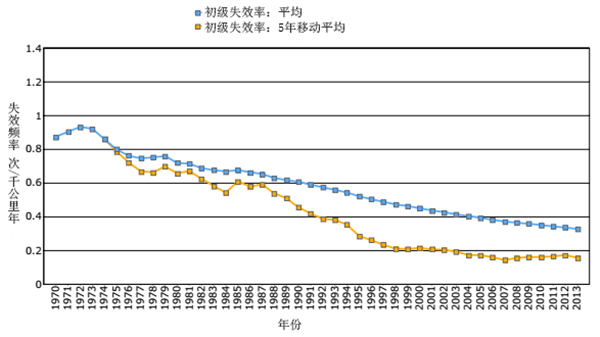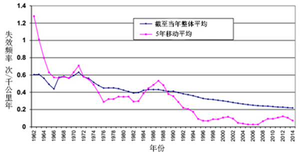 圖20 整體和5年移動(dòng)平均失效頻率(1962-2014年)