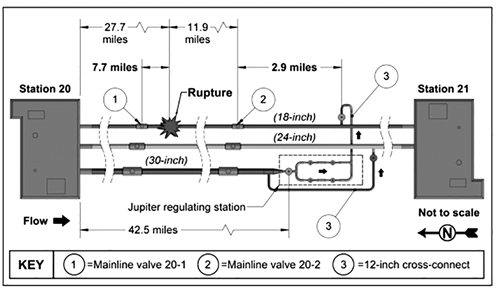 20#、21#壓氣站間共有3條管道,管道可以通過一條30英寸環(huán)線管道實現(xiàn)互通。事件發(fā)生時, 30英寸管道正向100#管道注入天然氣。另外,破裂點上下游各有一個自動關斷閥門,分別為20-1# 及20-2# 。