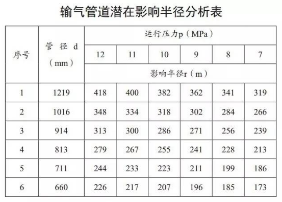 從上表數據可以看出,當管徑為1219毫米,壓力為12MPa時(如西氣東輸三線等),其潛在影響半徑達到418米。另外,《石油天然氣工程設計防火規(guī)范》(GB50183—2004)第7.2.2.1條對油氣田內部原油、天然氣凝液集輸管道與地面建(構)筑物的最小距離規(guī)定:與居民區(qū)、村鎮(zhèn)、重要公共建筑物不應小于30米,一般建(構)筑物不應小于10米。