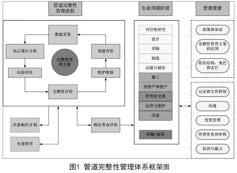 ( 1)完整性管理的定義、范圍和流程的確定。各國完整性管理的范圍和流程差異最大,沒有統(tǒng)一的定義,很多國家的完整性管理標(biāo)準(zhǔn)未涉及包括設(shè)計、施工等環(huán)節(jié)在內(nèi)的建設(shè)期,但均存在對建設(shè)期管道實施完整性管理的需求,范圍也不同。通過討論,確定了包括建設(shè)期和管道廢棄在內(nèi)的管道全生命周期的完整性管理需求。將失效分析、應(yīng)急管理、剩余壽命評估等與完整性管理密切相關(guān)的內(nèi)容也納入管道完整性管理體系中。形成的完整性管理體系框架圖如圖1所示。