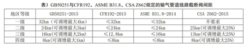 輸氣管道設(shè)置線路截斷閥的目的是便于管道維護修理以及當管道發(fā)生破損時,盡可能減少損失和防止事故擴大。對比GB50251-2015與CFR192、ASME B31.8、 CSA Z662發(fā)現(xiàn),我國與北美對輸氣管道線路截斷閥最大間距的要求基本相同,但需要指出的是, GB50251-2015參考CSA Z662規(guī)定允許按照地區(qū)等級對線路截斷閥間距進行調(diào)增。線路截斷閥最大間距規(guī)定匯總對比見表3。 49CFR 192對輸氣管道截斷閥間距要求較為嚴格。