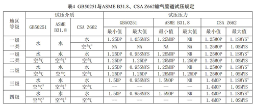 上述對比可以看出,試壓介質(zhì)選擇上CSAZ662的規(guī)定最為靈活,在試壓壓力上CSA Z662的規(guī)定最高; GB50251在試壓介質(zhì)規(guī)定上與美國法規(guī)、標準規(guī)定基本一致,對于三級、四級地區(qū)使用氣體試壓的規(guī)定一致,但對于一級、二級地區(qū)的最大允許試壓壓力規(guī)定有差異,水試壓時規(guī)定的最大允許試壓壓力低于美國。