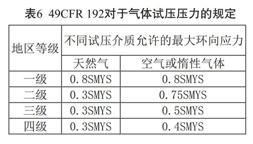GB50251-2015與ASME B31.8也對三級和四級地區(qū)使用空氣作為試壓介質(zhì)提出了條件限制,規(guī)定“三、四級地區(qū)的管道試壓時最高環(huán)向應(yīng)力分別小于50%SMYS 和40%SMYS”(見表5)。49CFR 192第192.505條對于高壓力(運行壓力大于或等于30%SMYS)管道的試壓規(guī)定為:對于一級、二級地區(qū)管道周邊300英尺( 91m)范圍內(nèi)有人員居住的建筑,試壓壓力不得低于最大運行壓力( MOP)的1.25倍,如果試壓壓力超過0.5SMYS時可將周邊居民疏散,可以使用氣體作為試壓介質(zhì)。在各地區(qū)等級采用氣體試壓時,第192.503條規(guī)定了最大試壓壓力(見表6)。