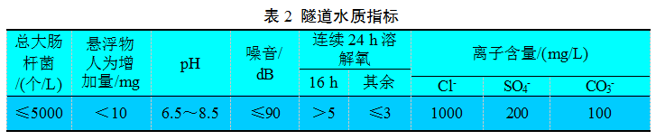 隧道水質(zhì)檢測(cè)指標(biāo)見表2。其中,懸浮物質(zhì)沉積于底部后不得對(duì)魚、蝦、貝類產(chǎn)生有害的影響,生化需氧量(COD)小于5 mg/L,5天化學(xué)需氧量(BOD)不超過2 mg/L。