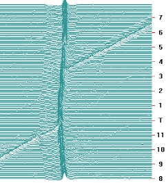 目前,國內大口徑長輸管道干線基本采用螺旋焊縫埋弧焊管道,經內檢測后可以清晰地看到螺旋焊縫和環(huán)焊縫信號(圖1)。內檢測缺陷定位時,通常先開挖參考環(huán)焊縫(也就是距離缺陷點最近的上游或者下游的環(huán)焊縫),通過螺旋焊縫與環(huán)焊縫的交角來判定開挖的參考環(huán)焊縫是否準確,缺陷定位開挖較方便。