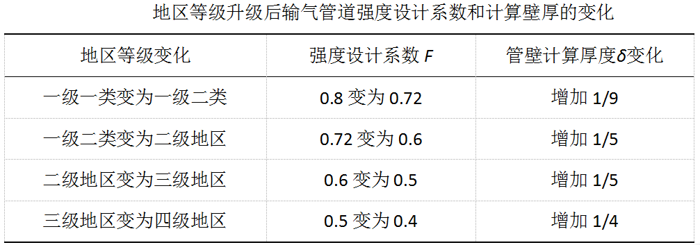 當(dāng)?shù)貐^(qū)等級發(fā)生升級變化時,管壁厚度δ和強(qiáng)度設(shè)計系數(shù)F的關(guān)系如下表所示。