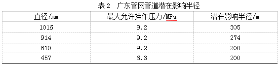 其中,管道潛在影響半徑按下式計(jì)算:r=0.099(r—潛在影響半徑,m;d—管段外徑,mm;p—管段最大允許操作壓力,MPa)。根據(jù)公式,廣東管網(wǎng)計(jì)算出不同管徑下的管道潛在影響半徑(表 2)。