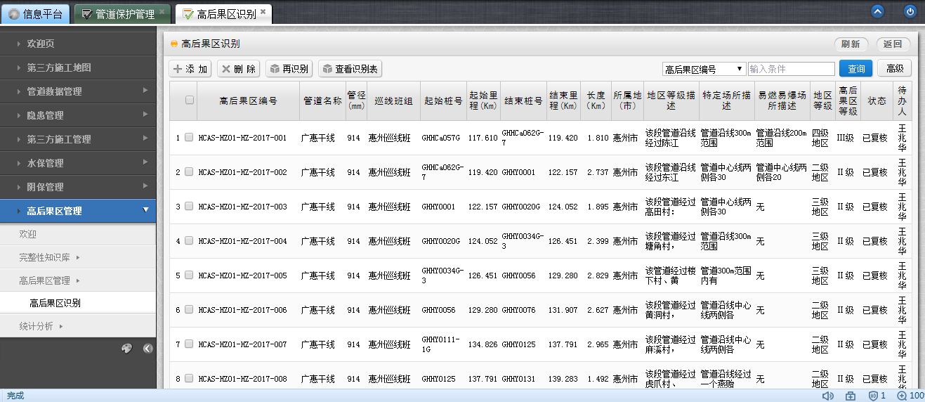 (1)建立高后果區(qū)檔案。根據(jù)GB 32167-2015要求,對(duì)高后果區(qū)的管道基礎(chǔ)信息、周邊環(huán)境信息、人口密集場(chǎng)所、特定場(chǎng)所、易燃易爆場(chǎng)所等信息及巡護(hù)人員、管理人員信息進(jìn)行登記建檔,定期排查與更新。