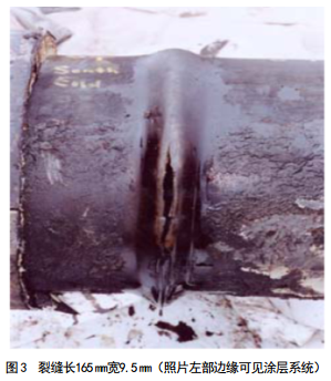 從事故管段切割了16 m長管道,在NTSB的實驗室進行了檢測。管道被壓彎,并在壓彎部位的內(nèi)徑出現(xiàn)了一個向外突出的彎曲,形成的彎曲角度在5~6度之間。彎曲沿管道周圍延伸約270度,從10點鐘位置延伸到7點鐘位置(圖 2)。彎曲區(qū)域包括一個在彎曲頂部敞開的裂縫,角度約從2點鐘位置延伸到4點鐘位置。彎曲的最大高度為25 mm,位于彎曲部內(nèi)側(cè),在3點鐘位置。裂縫最寬部的長度為165 mm,寬度為 9.5 mm(圖 3)。管道斷面在顯微鏡下進行觀察,未發(fā)現(xiàn)外部腐蝕現(xiàn)象。