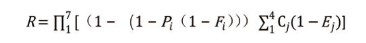 采用評分模型將P1至P7量化為0~1之間,表示發(fā)生概率。評分模型可以參考kent法的指標體系,但必須進行優(yōu)化。將F1至F7量化為0~1之間,表示防護措施的效果。從圖 2可以看出, P1至P7為邏輯或關(guān)系。將C1至C4量化為0~1之間,表示失效后果。 將E1至E4量化為0~1之間,表示應(yīng)急措施的效果。E1至E4為累計關(guān)系。這樣可以建立以下管道風險評價計算公式: