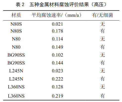 實驗研究了N80S、 N80、 BG90SS、 L245N、L360NS五種金屬材料在頁巖氣返排液無菌/有菌環(huán)境中及常壓/高壓條件下的腐蝕狀況,結(jié)果得出以下結(jié)論。