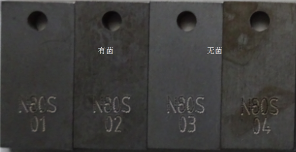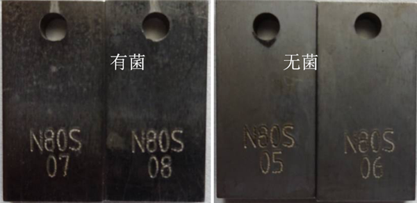 根據(jù)NACE RP0775―2005,從表 2可以看出:①N80S在無菌環(huán)境中腐蝕速率為0.021 mm/a,有菌環(huán)境中的腐蝕速率是無細(xì)菌環(huán)境中的8.48倍,分別屬于輕度腐蝕和嚴(yán)重腐蝕。②N80在無菌環(huán)境中腐蝕速率為0.114 mm/a,有菌環(huán)境中的腐蝕速率是無細(xì)菌環(huán)境中的1.31倍,分別屬于中度腐蝕和嚴(yán)重腐蝕。③BG90SS在無菌環(huán)境中腐蝕速率為0.102 mm/a,有菌環(huán)境中的腐蝕速率是無細(xì)菌環(huán)境中的1.41倍,分別屬于中度腐蝕和嚴(yán)重腐蝕。④L245N在無菌環(huán)境中腐蝕速率為0.023 mm/a,有菌環(huán)境中的腐蝕速率是無細(xì)菌環(huán)境中的9.65倍,分別屬于中度腐蝕和嚴(yán)重腐蝕。⑤L360NS在無菌環(huán)境中腐蝕速率為0.128 mm/a,有菌環(huán)境中的腐蝕速率是無細(xì)菌環(huán)境中的1.71倍。均屬于嚴(yán)重腐蝕。試片表面為均勻腐蝕,部分存在點蝕,如圖 3所示。