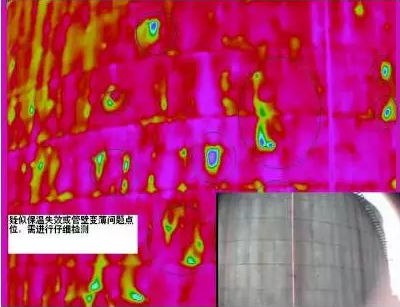 采用定點熱成像儀進行監(jiān)測,可清晰識別保溫失效程度,提供重點點位進行掃描檢測,為辨別保溫層脫落或罐壁腐蝕失效提供預(yù)處理定位依據(jù)。