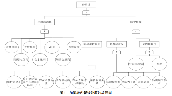 加固墩內(nèi)管線內(nèi)腐蝕故障樹如圖 2所示。內(nèi)腐蝕受含腐蝕介質(zhì)和防腐措施失效共同影響。天然氣屬干氣輸送,即使含有CO2、 H2S等腐蝕性成分,沒有水的存在,腐蝕就難以發(fā)生。因此,內(nèi)腐蝕風(fēng)險(xiǎn)相對較低,控制措施應(yīng)從監(jiān)控脫水效果和內(nèi)檢測監(jiān)控著手。
