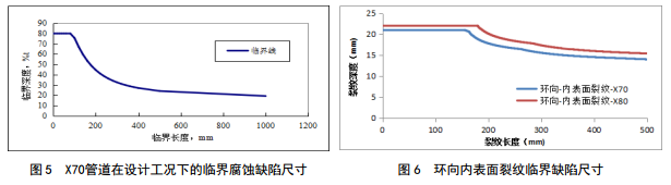 加固墩處管線管體腐蝕缺陷臨界尺寸和環(huán)向內(nèi)表面裂紋缺陷臨界尺寸,分別按ASME B31G―2012―3770和API 579計(jì)算,如圖 4、圖 5、圖 6所示。在下次內(nèi)檢測過程中,發(fā)現(xiàn)存在腐蝕型缺陷和環(huán)向裂紋缺陷,可按照圖 4~6給出的腐蝕缺陷臨界尺寸和環(huán)向裂紋缺陷臨界尺寸判斷是否可接受。當(dāng)評估點(diǎn)坐標(biāo)落在曲線下方時(shí),缺陷可以接受;評估點(diǎn)位于曲線上方 時(shí)缺陷不能接受。由此可判斷可能出現(xiàn)的缺陷是否處于可接受范圍內(nèi)。