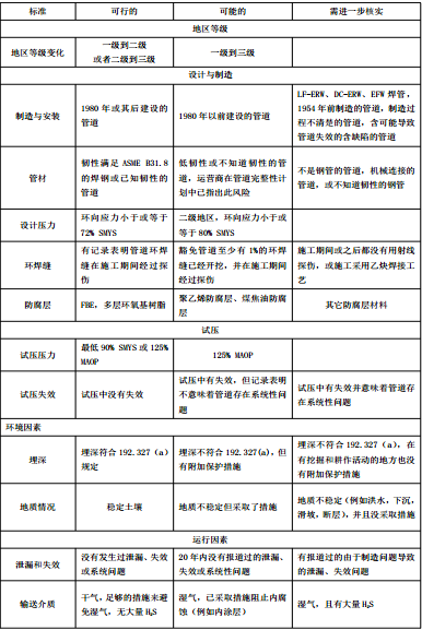 應(yīng)考慮每一份申請(qǐng)的完整性,對(duì)運(yùn)行時(shí)隱含高危險(xiǎn)的管道應(yīng)給予嚴(yán)格的審查,增大核實(shí)等級(jí)。表 1詳細(xì)列出了OPS在豁免管道等級(jí)時(shí)所考慮的管道設(shè)計(jì)參數(shù)和運(yùn)行情況,分為三個(gè)類別:①豁免是可行的;②豁免是可能的;③需進(jìn)一步核實(shí)才能豁免。
