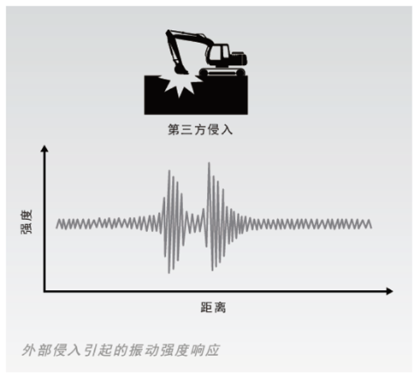 第三方入侵擾動會在土壤中產(chǎn)生微弱的壓力或振動,感應光纖(標準通信光纜)隨即感應,借助軟件復雜算法進行分類,以判定信號來自異常事件還是正常的環(huán)境變化。