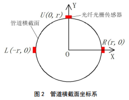 基于彈性力學(xué)理論,管道變形后管道橫截面仍處于一個(gè)平面的基本假設(shè),以管道橫截面中心為圓心,以橫截面水平方向?yàn)閤軸,垂直方向?yàn)閥軸,管道橫截面坐標(biāo)系見圖 2, L、 U、 R分別表示管道橫截面左側(cè)、頂部、右側(cè)三點(diǎn),圖中灰色長(zhǎng)方形表示光纖光柵傳感器。