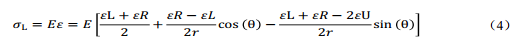 式中, E為管線鋼彈性模量, MPa; σL為管道截面任一點(diǎn)處的軸向應(yīng)力, MPa。可通過現(xiàn)場(chǎng)傳感器測(cè)量L、 U、 R三點(diǎn)應(yīng)變值, 依據(jù)式(4)求得監(jiān)測(cè)截面環(huán)向360°任一點(diǎn)處的軸向應(yīng)力值。