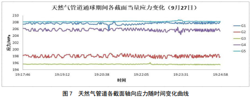 2016年9月27日19:19,清管器跟蹤人員接收到信號(hào)顯示清管器進(jìn)入瀾滄江跨越段, 19:24通過跨越段。天然氣管道各截面軸向應(yīng)力隨時(shí)間變化曲線如圖 7所示: 19:20:54至19:23:30清管器依次通過天然氣管道G1至G5共5個(gè)截面,與現(xiàn)場(chǎng)跟蹤人員監(jiān)聽時(shí)間基本一致。