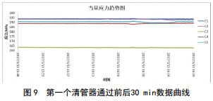 為了更好地反映投產(chǎn)期間管道應(yīng)力變化,選取第一個(gè)清管器通過前后一天數(shù)據(jù)(圖 8)、前后共 30 min數(shù)據(jù)(圖 9)分析管道應(yīng)力變化。
