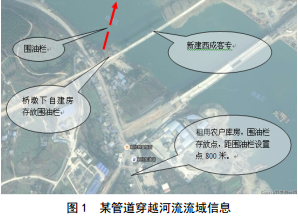 管道水域高后果區(qū)是管道應(yīng)急防控的重點區(qū)域。為此組織站場認(rèn)真勘察穿越河流,梳理相關(guān)信息,建立了管道穿越流域信息數(shù)據(jù)庫。主要信息包括穿越地點、河流名稱、河流寬度、河流走向、分季節(jié)流速和水位等。據(jù)此確定每處穿越點溢油回收位置、圍油欄敷設(shè)點、應(yīng)急物資儲備點,并將其位置信息制成圖集,如圖 1所示。