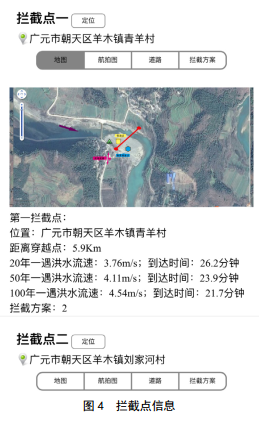 這款A(yù)PP可以在手機(jī)、平板電腦等移動終端使用。可以看到整個穿越水系總圖,顯示每條河流信息及環(huán)境敏感區(qū)位置,每個穿越點有對應(yīng)編號。點擊編號可以顯示穿越點位置、下游攔截點位置和攔截方案、下游匯入口位置、下游環(huán)境敏感區(qū)位置以及到達(dá)相應(yīng)位置的時間。每個位置都有谷歌截圖和現(xiàn)場航拍照片,直觀顯示收油桶和物資堆放位置、進(jìn)場公路等,如圖 4所示。點擊對應(yīng)的穿越點或者攔截點,自動跳轉(zhuǎn)到手機(jī)地圖(百度地圖、高德地圖),并導(dǎo)航到該位置。