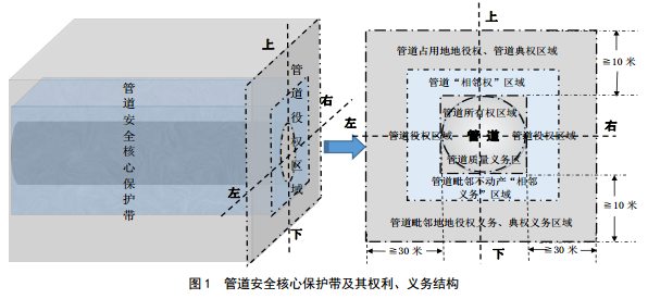 管道安全核心保護(hù)帶是以管體為中心、以管道財產(chǎn)所有權(quán)為半徑的保護(hù)管道財產(chǎn)安全的管道安全中心區(qū)域帶(圖 1),其法律義務(wù)都是法定義務(wù),其保護(hù)法益是管道財產(chǎn)安全。分為兩個層次:一是管道企業(yè)所承擔(dān)的管道質(zhì)量義務(wù),實(shí)質(zhì)上是管道財產(chǎn)所有權(quán)本身所負(fù)擔(dān)的法定義務(wù)。二是管道基于不動產(chǎn)相鄰關(guān)系而施加于管道毗鄰不動產(chǎn)所有權(quán)、使用權(quán)的合理限制或負(fù)擔(dān),實(shí)質(zhì)上是基于民法的不動產(chǎn)相鄰關(guān)系的管道所有權(quán)權(quán)能在管道毗鄰不動產(chǎn)上的合理延伸。