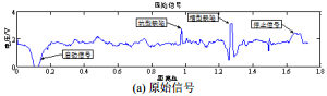 傳感器位于被測表面正上方約16 mm處,沿管的軸向的推進速度約為1 m/s。利用本文提出的方法對脈沖磁渦流信號進行處理,結(jié)果如圖 7所示:圖 7(a)為原始信號,圖 7(b)為基于sym8小波降噪后的信號,圖 7(c)為降噪信號的第一層IMF。