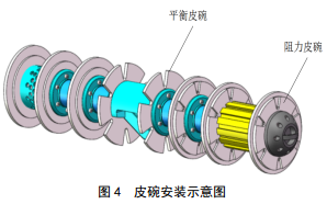 阻力皮碗既要保證有一定的強(qiáng)度和密封性,又要防止阻力太大造成推動不均勻、不順暢,影響檢測器在管道中的勻速行進(jìn)。經(jīng)過大量試驗(yàn)反復(fù)修改皮碗幾何尺寸等參數(shù),最終優(yōu)化確定最合理的尺寸參數(shù),確保檢測器在管道中的通過性。皮碗安裝示意見圖 4。
