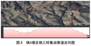 選擇采油十一廠鎮(zhèn)4增至鎮(zhèn)三轉(zhuǎn)集油管道800 m管段進(jìn)行檢測試驗(yàn),管道基本情況和高程見表 2和 圖 8。檢測結(jié)果在123.7 m處,壁厚信號振幅達(dá)486,疑似缺陷,見圖 9。