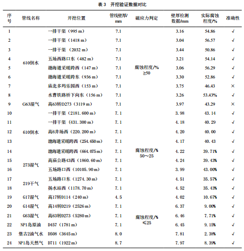 檢測(cè)出一級(jí)腐蝕點(diǎn)18處,二級(jí)腐蝕點(diǎn)544處,三級(jí)腐蝕點(diǎn)2 857處,對(duì)部分腐蝕點(diǎn)開(kāi)挖驗(yàn)證,數(shù)據(jù)對(duì)比見(jiàn)表 3。