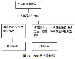 發(fā)送帶有發(fā)射機(jī)的直板清管器將遺留檢測(cè)器推出,如若二次卡堵,利用發(fā)射機(jī)定位卡堵點(diǎn),進(jìn)入斷管取球程序。作業(yè)流程見圖 10。