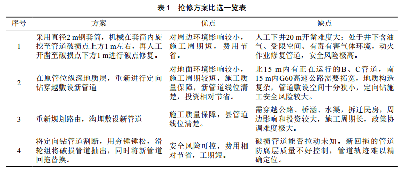 根據(jù)管道破損點(diǎn)周邊環(huán)境,初步確定四套搶修方案(表 1)。