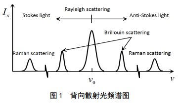 激光入射到光纖中,會產(chǎn)生各種光散射,包括彈性散射和非彈性散射。光纖中的光散射主要包括瑞利散射(Rayleigh Scattering),拉曼散射(RamanScattering)和布里淵散射(Brillouin Scattering),圖1為背向散射光頻譜圖。其中瑞利散射光是入射光與物質發(fā)生的彈性散射,散射光頻率不發(fā)生變化,拉曼散射光和布里淵散射光是入射光與物質發(fā)生非彈性散射,散射光頻率發(fā)生變化。實驗采用C-OTDR技術探測光纖中的瑞利散射。