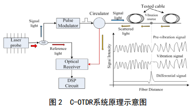 長距離分布式光纖C-OTDR系統(tǒng)原理如圖2所示,窄帶激光器發(fā)射連續(xù)激光,經(jīng)過3dB耦合器將連續(xù)光分成兩路,一路光作為本振參考光,另一路光經(jīng)過脈沖調制將連續(xù)激光調制為脈沖激光輸入到被測光纖中產(chǎn)生散射光信號,將散射光信號與參考光進行外差相干獲得被測光纖上各監(jiān)測點的擾動信號,從而實現(xiàn)被測光纜沿線的外界入侵監(jiān)測。圖2中坐標圖分別展示了振動源作用前、作用時及作用后的差分信號波形示意圖。振動信號作用時,作用點光纖前端及尾端的信號不受作用點信號串擾。