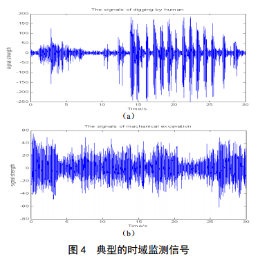 圖4(a)為典型的人工挖掘時域監(jiān)測信號曲線,圖4(b)為典型的挖掘機在管道附近真實挖掘行為的時域監(jiān)測信號曲線。其中,人工挖掘位置相對于監(jiān)測主機近,機械挖掘相對于監(jiān)測主機遠,因此人 工挖掘的整體信號強度比機械挖掘強,且相對于機械挖掘信號更清晰,主要是機械挖掘受發(fā)動機震動的影響,導致信號整體能量較強,而人工挖掘信號局部較強。