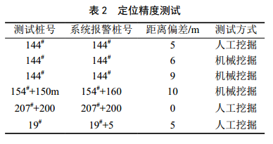表2為測試點的定位精度測試結果,實驗結果顯示在測試樁號處進行人工挖掘激勵和機械挖掘激勵下均能準確報警,報警樁號與測試樁號的距離偏差具有隨機性,但總體距離偏差不超過10 m,與本測試系統(tǒng)的定位精度(10 m)比較吻合。