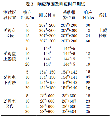 表3為響應范圍及響應時間測試結果。在各監(jiān)測區(qū)段各選一個實驗點,分別選擇垂直于管道走向5、10、 15、 20 m 四個測試點,機械挖掘作為激勵源。結果顯示各個測試點均有報警輸出,所不同的是報警響應時間與測試點的土壤硬度有關。分析表明本系統(tǒng)能響應垂直于管道20 m范圍的挖掘行為,當管道周邊為干燥硬質土壤時其總體響應時間在30 s內,若為松軟土壤,則其響應時間會相應延長。