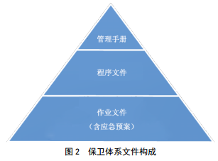 (2)保衛(wèi)工作體系文件。遵循符合性、可操作性、可檢查性和唯一性的原則,包括管理手冊(cè)、程序文件、作業(yè)文件三個(gè)層級(jí),如圖 2所示。管理手冊(cè):明確保衛(wèi)管理理念、方針、原則和目標(biāo),明確相關(guān)組織、人員在開展管理活動(dòng)中的職責(zé)和要求,是指導(dǎo)工作的綱領(lǐng)。程序文件:為保證方針、目標(biāo)的實(shí)現(xiàn),規(guī)范公司各級(jí)安保管理活動(dòng)的文件;以風(fēng)險(xiǎn)管理為主線,對(duì)安保風(fēng)險(xiǎn)進(jìn)行辨識(shí)、評(píng)估,并策劃風(fēng)險(xiǎn)處置方案,明確誰(shuí)做,做什么,做到什么程度等內(nèi)容。作業(yè)文件:是程序的支持性文件,提供了具體操作指南。