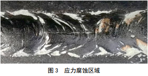 管道應(yīng)力腐蝕區(qū)域,呈現(xiàn)特殊類型的細(xì)、淺和分 枝開裂,常發(fā)生在涂層失效時(shí),特別是無(wú)有效的陰極防護(hù)措施時(shí),如圖 3所示。