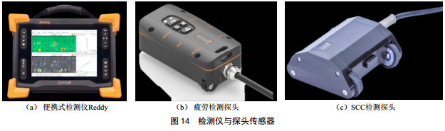 根據(jù)切向渦流原理,提出了一套完整的專用解決方案;設(shè)計(jì)了專為現(xiàn)場(chǎng)使用的便攜式檢測(cè)儀Reddy®;開發(fā)了嵌入式Magnifi軟件;開發(fā)了SharckBW探頭用于管道焊縫的疲勞開裂、 sharck HR探頭用于管道母材的SCC,如圖 14所示。