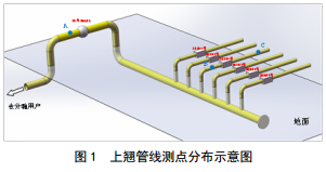 測點分布:根據(jù)上翹管線的初步受力分析,選擇3個危險點(A、 B、 C)作為測點,如圖 1所示。