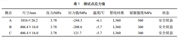 管線材質(zhì)為L360鋼,屈服強度為360 MPa。研究表明壓應力引發(fā)疲勞裂紋或斷裂,其門檻值比拉應力高3~4倍[4]。所以測點A、 B、 C均處在安全狀態(tài)。